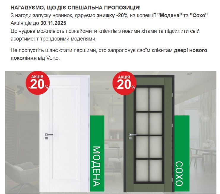 Також діють ексклюзивні пропозиції для учасників державної програми єВідновлення. Якщо ви плануєте купити двері або підлогу за компенсацією — обов’язково ознайомтеся з умовами наших акцій.